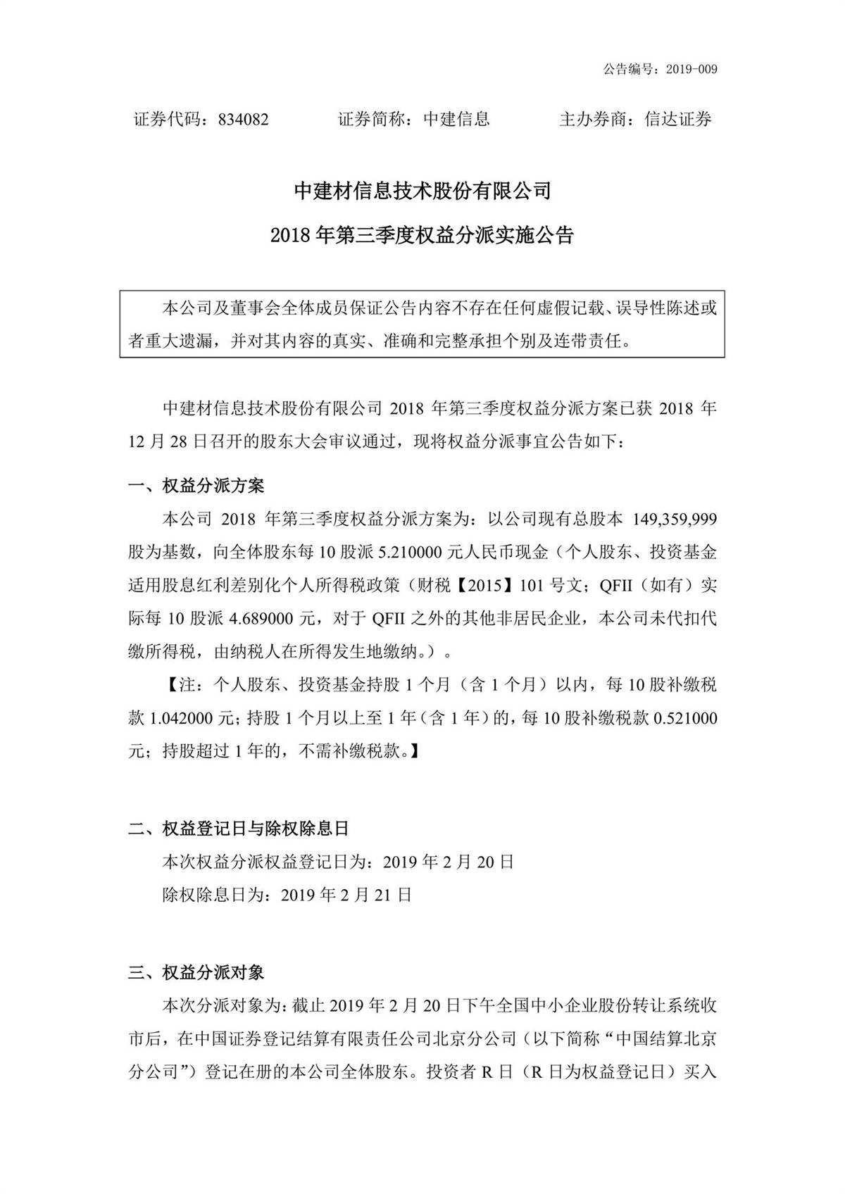 中建信息2018年第三季度權(quán)益分派實(shí)施公告